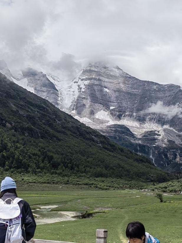 雪山对于每个人来说都心驰神往,我们也很努力地往上爬。一路上各年龄段的人都会有,有些老人的体力甚至比一般的年轻人要更好。每个人的装扮都大同小异,拿着登山杖,穿着冲锋衣,累了就靠边坐着休息、喝水、补充能量,时不时地要吸氧来缓解缺氧。从下午十二点一直到傍晚四五点钟,我们一路上走走停停,谈笑风生,终于到达了牛奶海,登临绝顶时方觉千峰如画。
